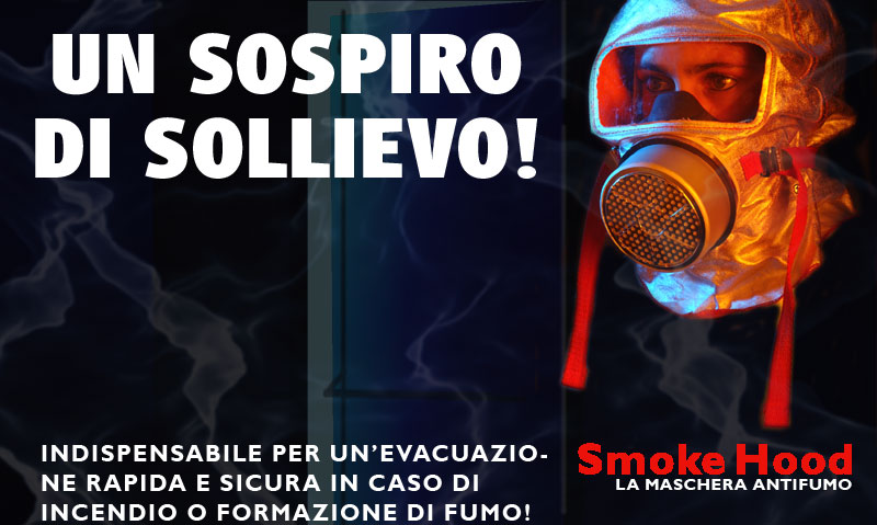 indispensabile per un’evacuazione rapida e sicura in caso di incendio o formazione di fumo UN SOSPIRO DI SOLLIEVO... Attualmente la sicurezza antincendio è al centro dell'attenzione. Infatti, agire subito ed in modo efficace è di importanza vitale. A questo proposito misure preventive quali i rilevatori di fumo, le coperte antifiamma e gli estintori giocano un ruolo importante. Eppure l'esperienza ci insegna che in caso di principio incendio la forte formazione di fumo è causa della maggior parte delle vittime. Una scarsa visuale, un orientamento inadeguato e sostanze nocive che si sono liberate rendono difficili i tentativi di evacuazione tempestiva dell’edificio. La maschera antifumo Smoke Hood aiuta a mantenere il sangue freddo ed è indispensabile per un’evacuazione rapida e sicura in caso di incendio o formazione di fumo. La maschera Smoke Hood è resistente ad una temperatura di 800°C. Grazie alla visiera anticalore si mantiene la capacità di orientamento ed è possibile lasciare l’edificio senza farsi prendere dal panico. OMOLOGAZIONE EUROPEA... La maschera antifumo Smoke Hood offre almeno 15 minuti di protezione dalla formazione rapida di fumo e da tutti i gas tossici indicati nella norma E403. La maschera è stata ampiamente testata e soddisfa più che sufficiente le severe disposizioni della norma europea E403: 1993-S. Il primo strato depurante filtra le particelle di fumo e di fuliggine, la seconda parte filtrante della maschera ferma i gas dannosi e successivamente un catalizzatore fa sì che il monossido di carbonio rimanente viene trasformato in anidride carbonica. Infine, questa sostanza è assorbita dall'ultimo strato. Entro alcuni secondi si può tirare un sospiro di sollievo. AUTOEVACUAZIONE SICURA... Le cifre attuali rivelano che decine di persone ogni anno sono vittime di incendi e centinaia di persone finiscono in ospedale con lesioni gravi. La maschera Smoke Hood può modificare questa situazione. La maschera antifumo è adatta all'impiego monouso e garantisce un ottimo funzionamento per una durata di cinque anni dalla data di produzione. La presenza della maschera Smoke Hood dà un senso di sicurezza ma non è in grado in nessun modo di assumere il compito dei vigili del fuoco. La maschera Smoke Hood provvede soltanto ad una autoevacuazione rapida e sicura, sia a casa che a scuola, in uffici e officine, discoteche, in centri di cura ed in altri luoghi molto frequentati. Anche per camionisti e autisti di pullman nel trasporto internazionale (gallerie!) e per gente di affari (alberghi!) la presenza di una Smoke Hood può essere di importanza vitale.